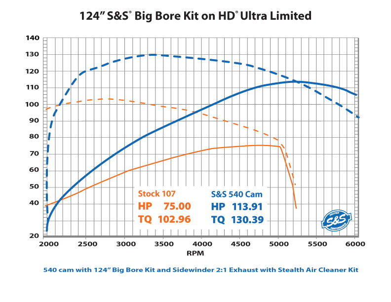 - 540 cam powerband further enhances massive torque output of our popular 124” and 128” Big Bore Kits