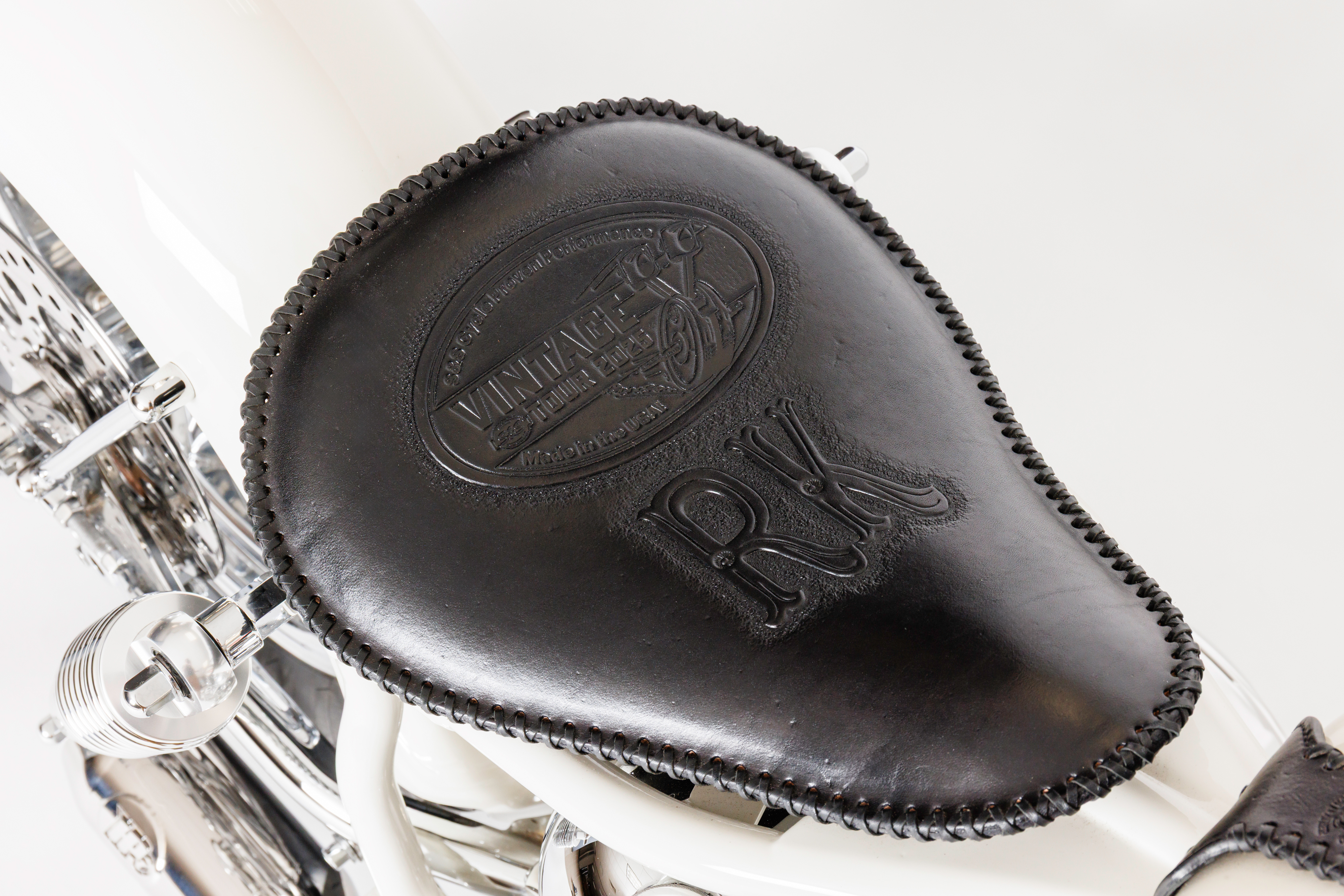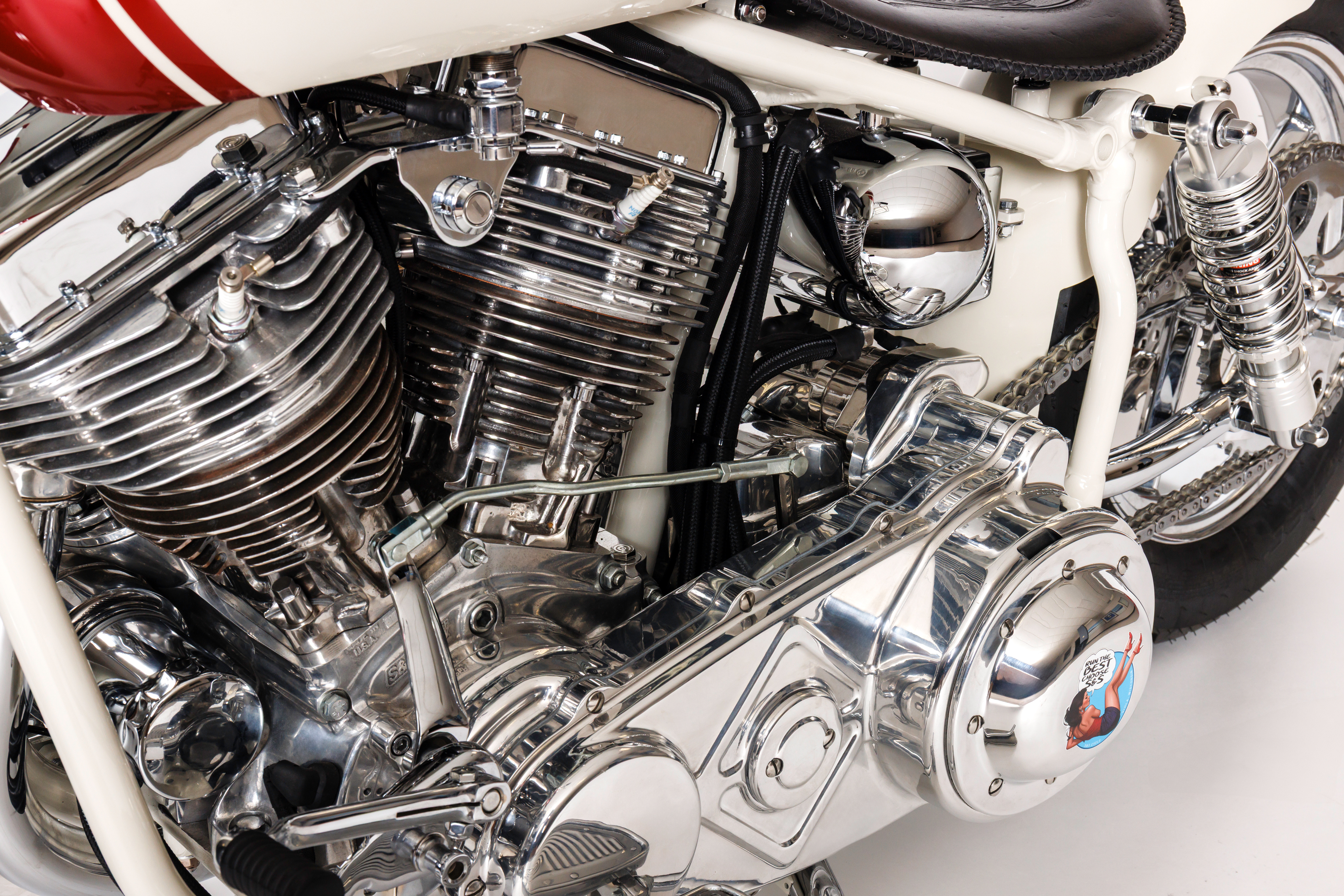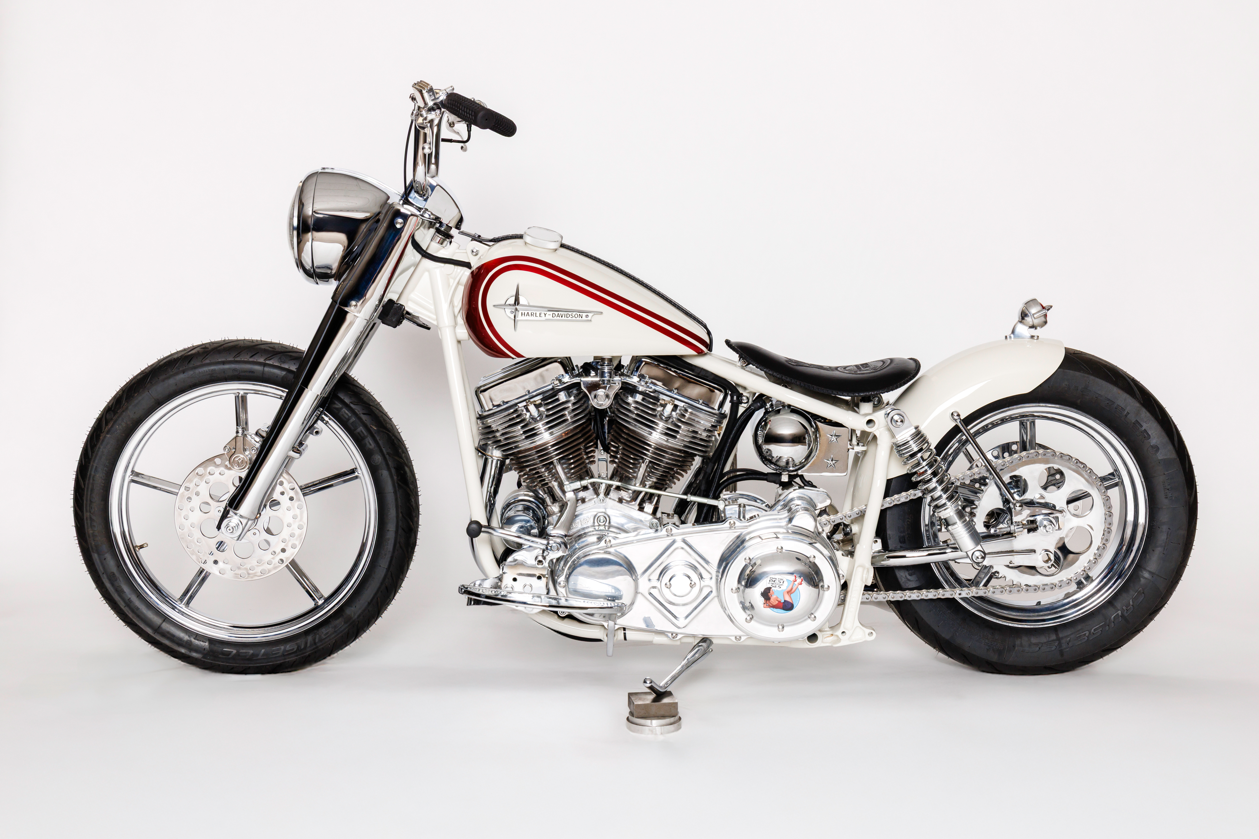 Brian restored a 1961 Panhead® frame, using a S&S 93" pan as the powerplant and utilizing a polished Baker 6 transmission. The tins were customized from a 1945 donor, brought to life by Gjerde Production Paint in a Birch White/Petter Red finish. The bike sits on Led Sled custom mags supported by Progressive forks and Drag Specialty shocks. Other features include a Duane Ballard Seat, Baker Tin Type Billet Primary, BDL Belt Drive, PM Brakes, Jeff Cochran Oil Tank, Exile Internal Throttle, Kustom Tech Controls, Pyke Starter, Metzeler Tires, Chrome by JD Plating.