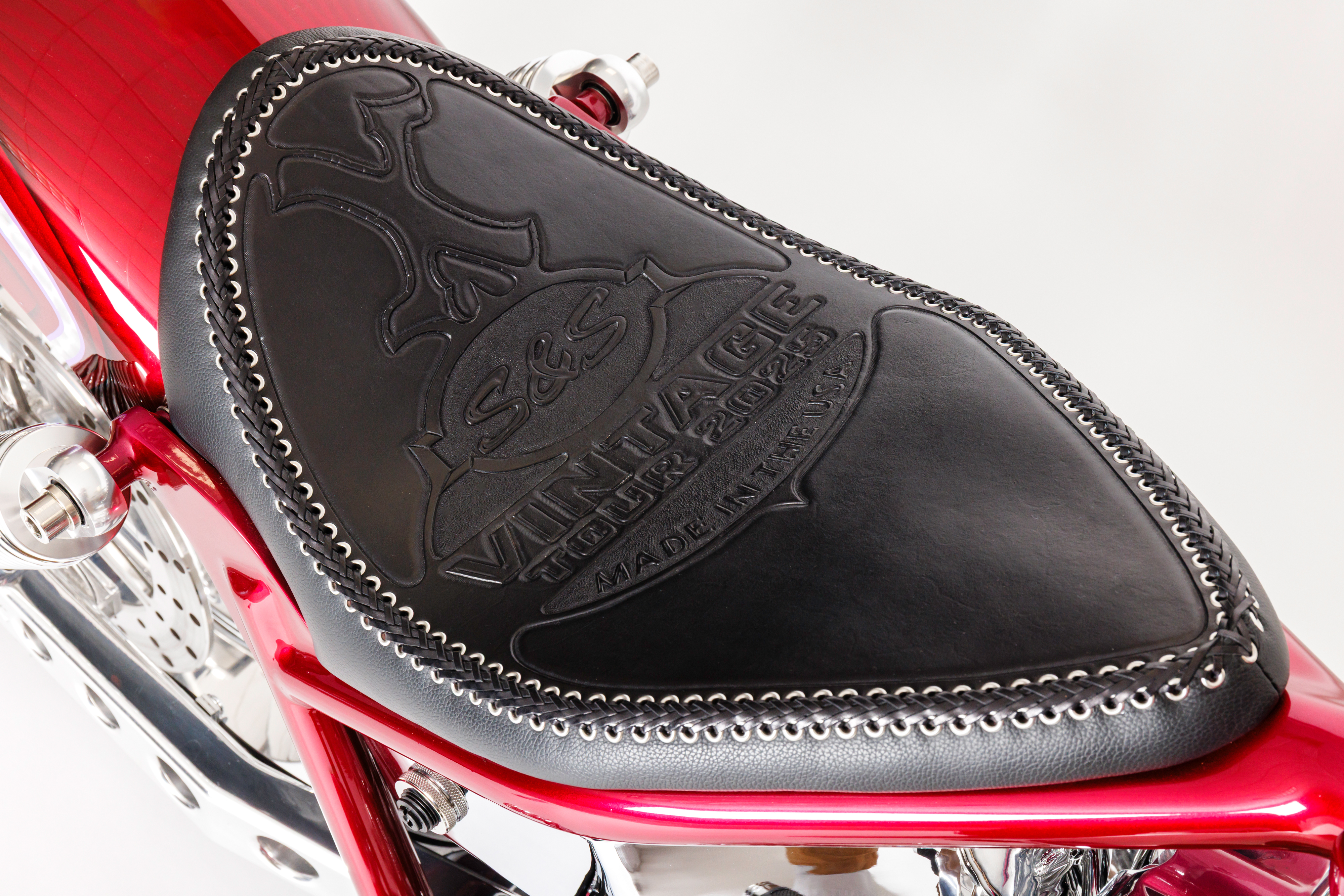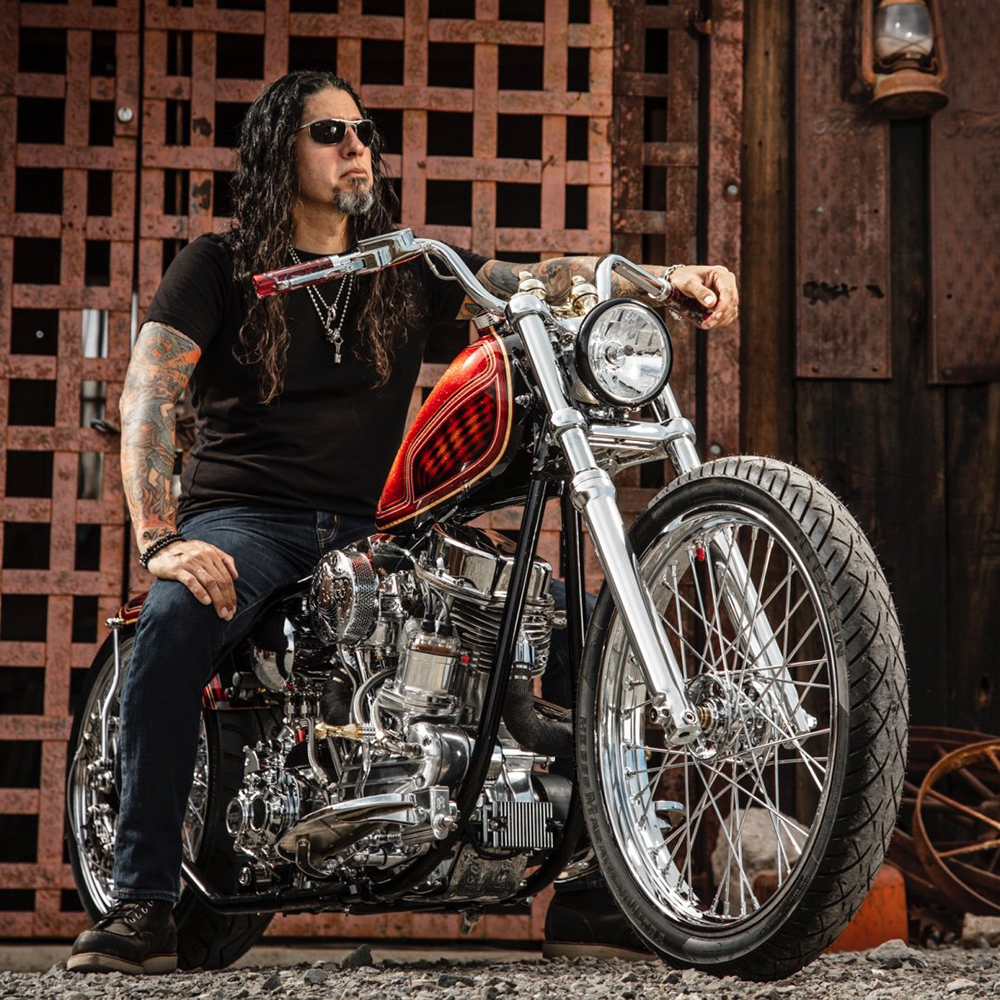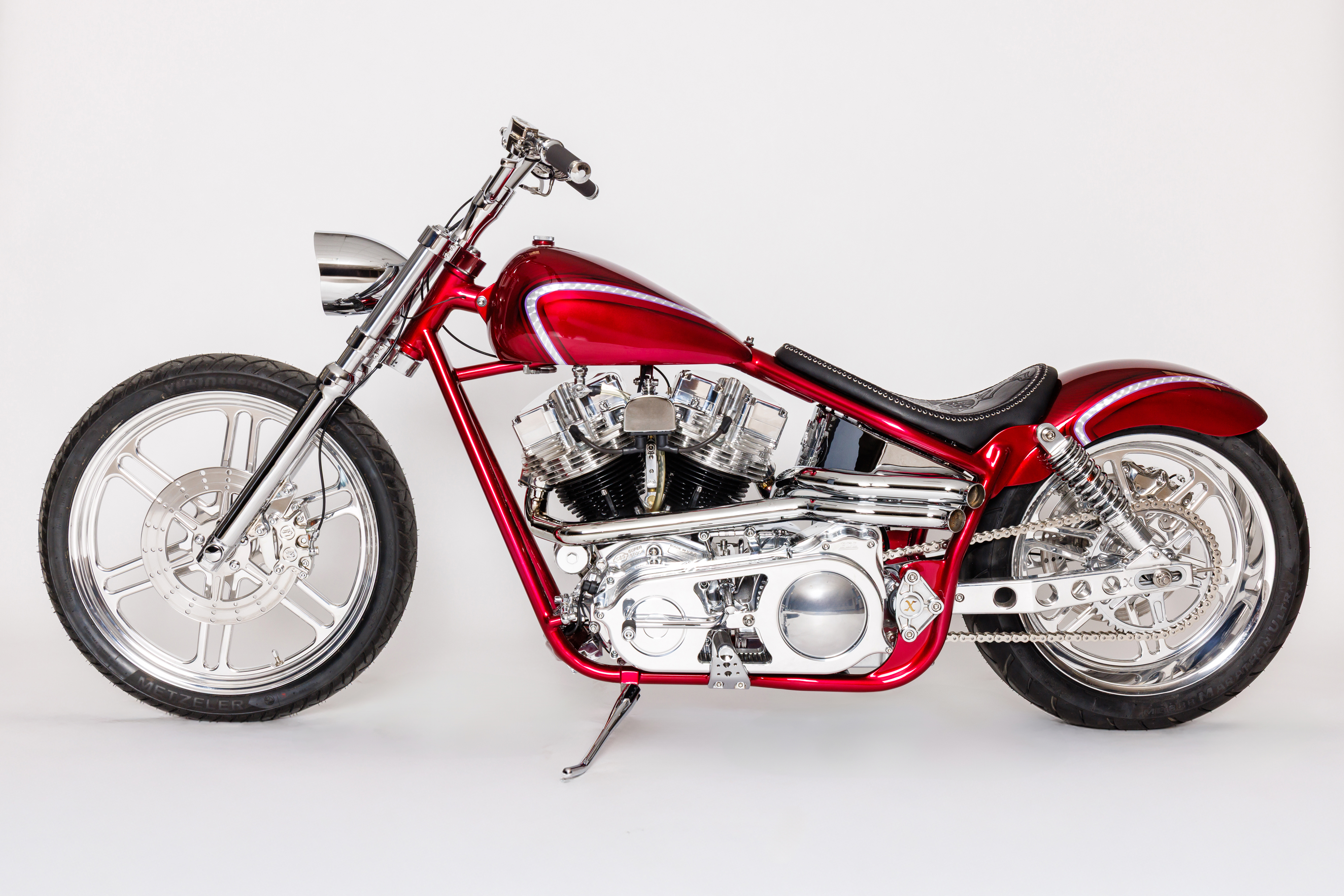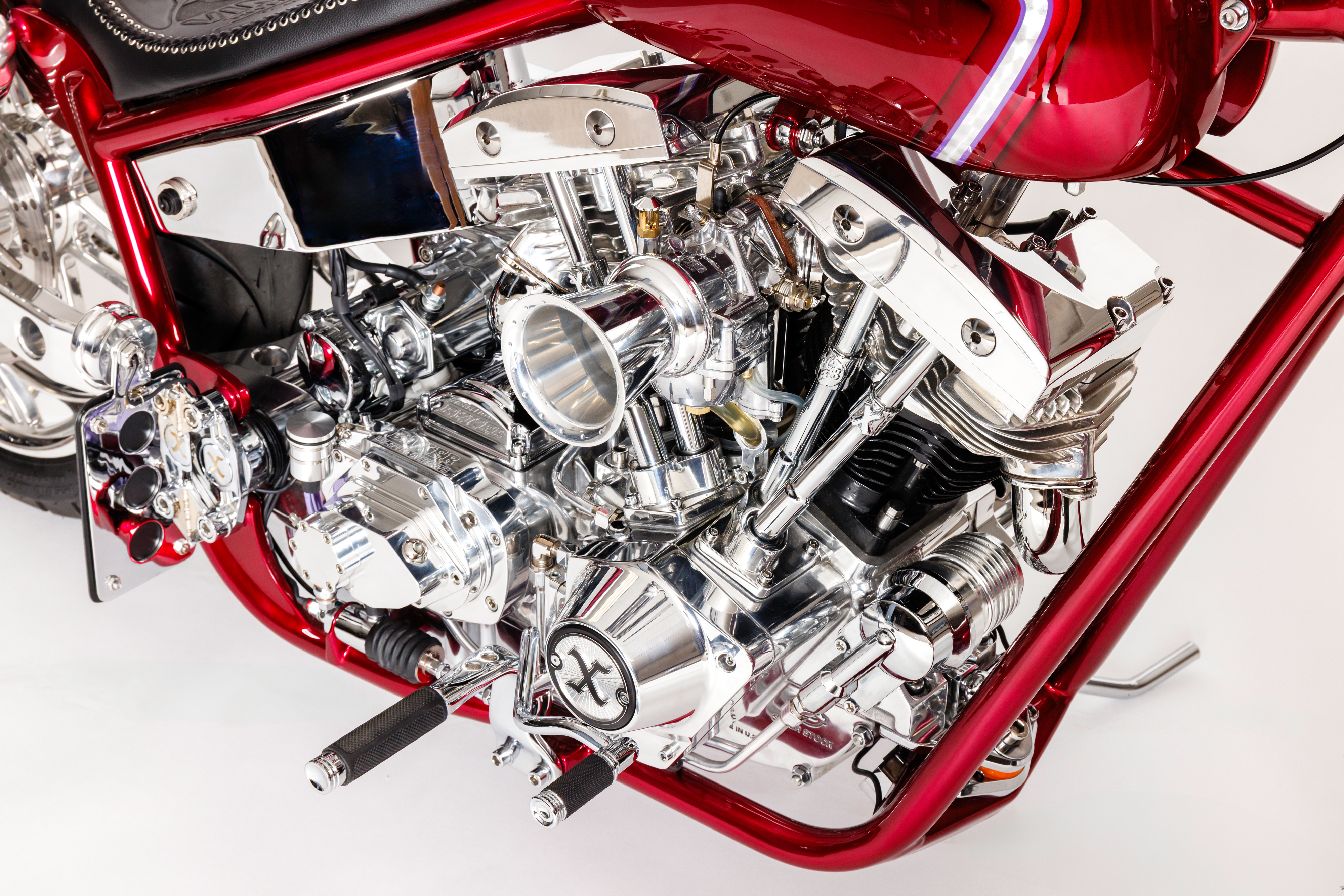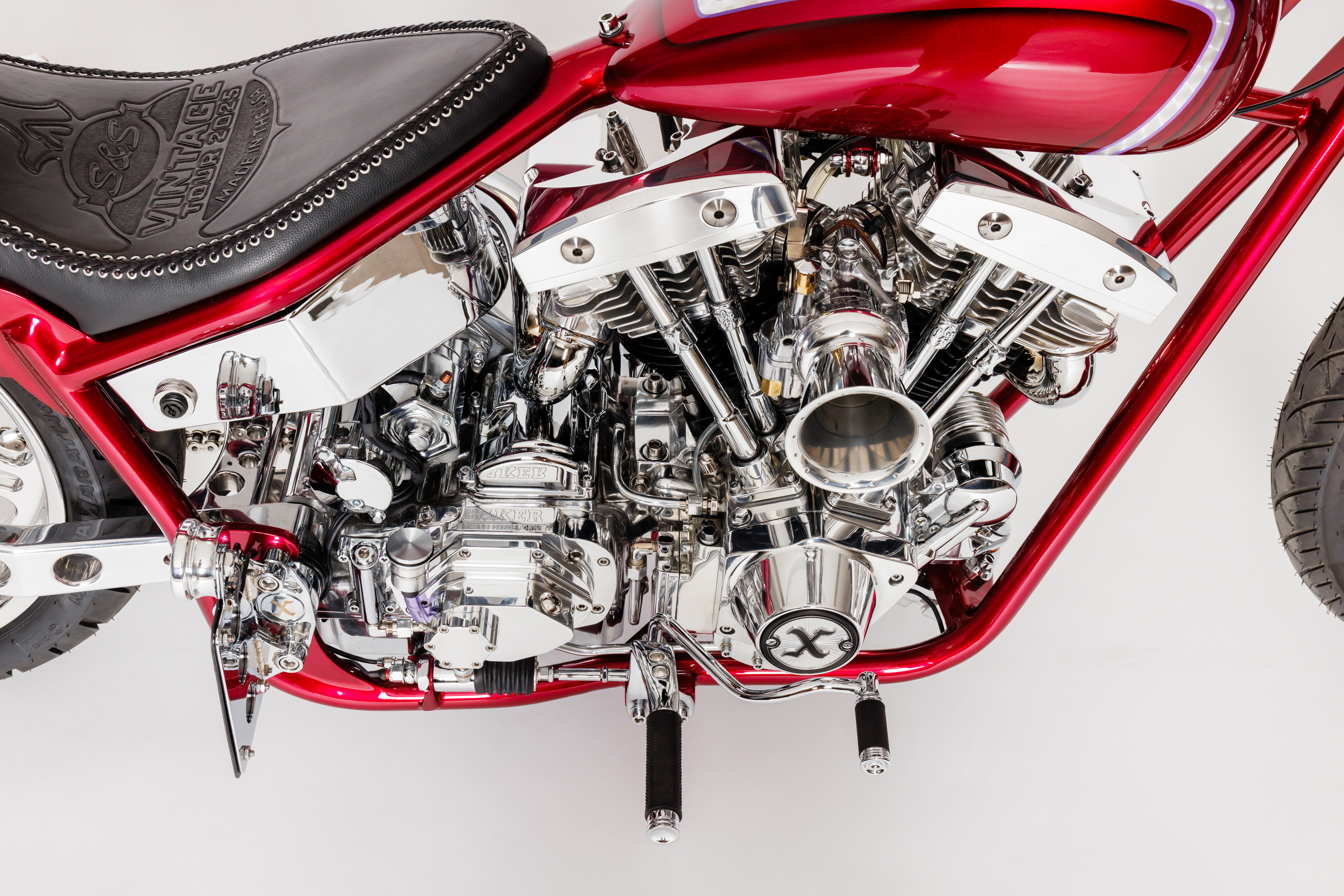 Xavier's build utilizied an S&S SH93 mounted to a Baker 6 speed in a modified Kenny Boyce frame. The tins were done by Xavier and painted by Jace at Fast Life Garage. The Progressive front suspension and DS shocks in the rear sit on Extreme Machine wheels. Other special features include wide custom Providence Cycle Worx Swingarm by Dan Toce at Toce Performance, foot controls, bars, risers, battery box and exhaust by Xavier.