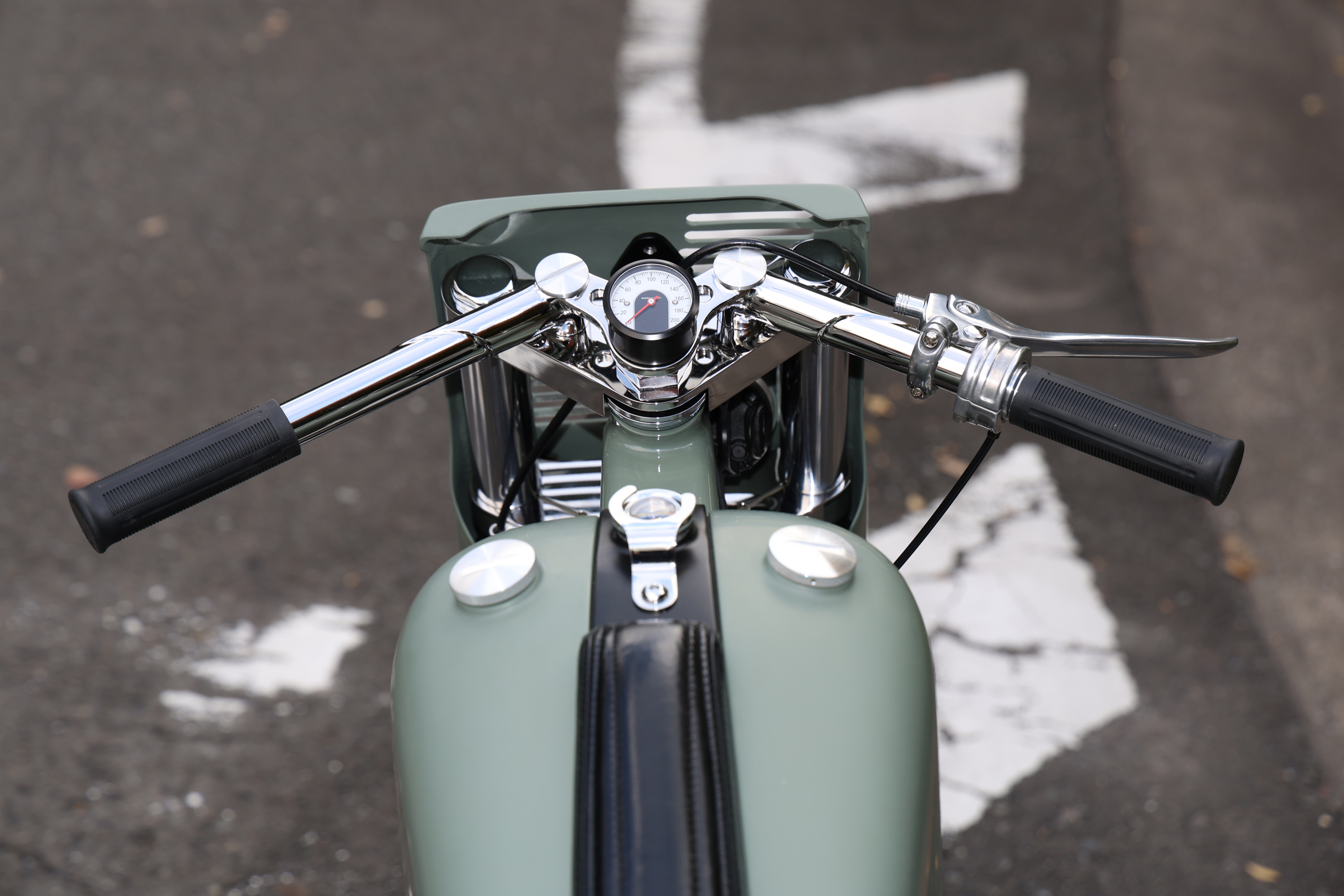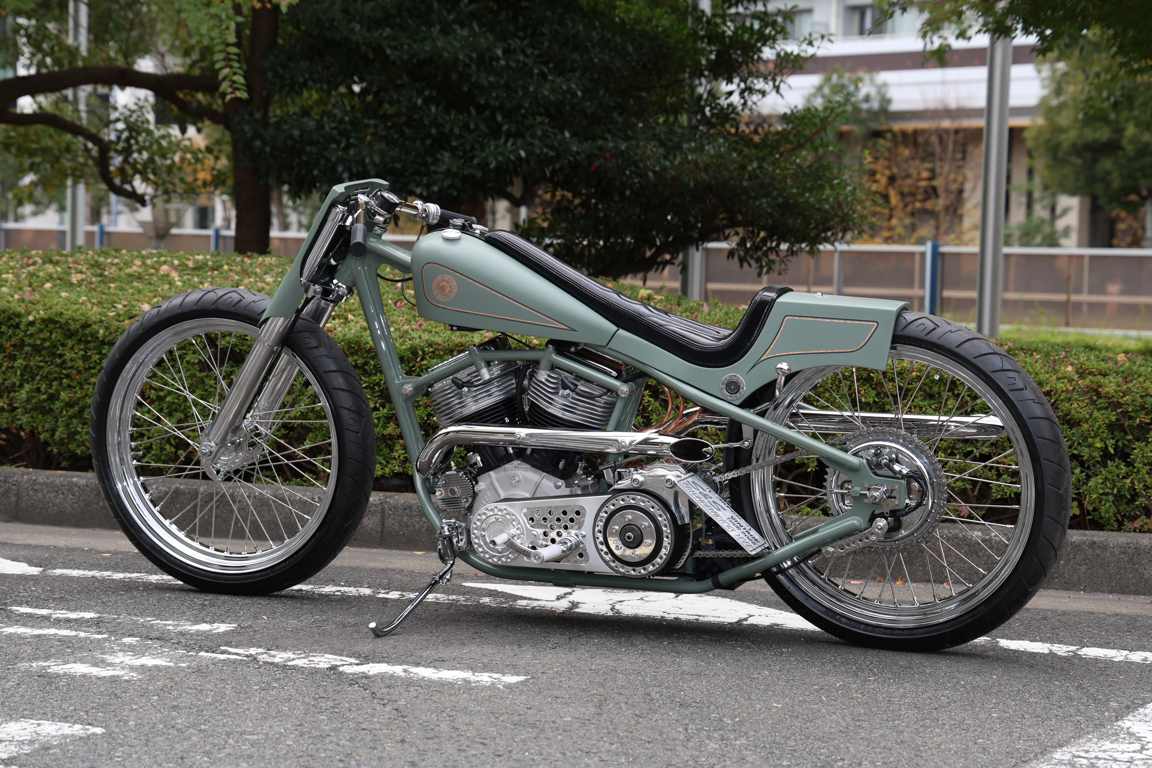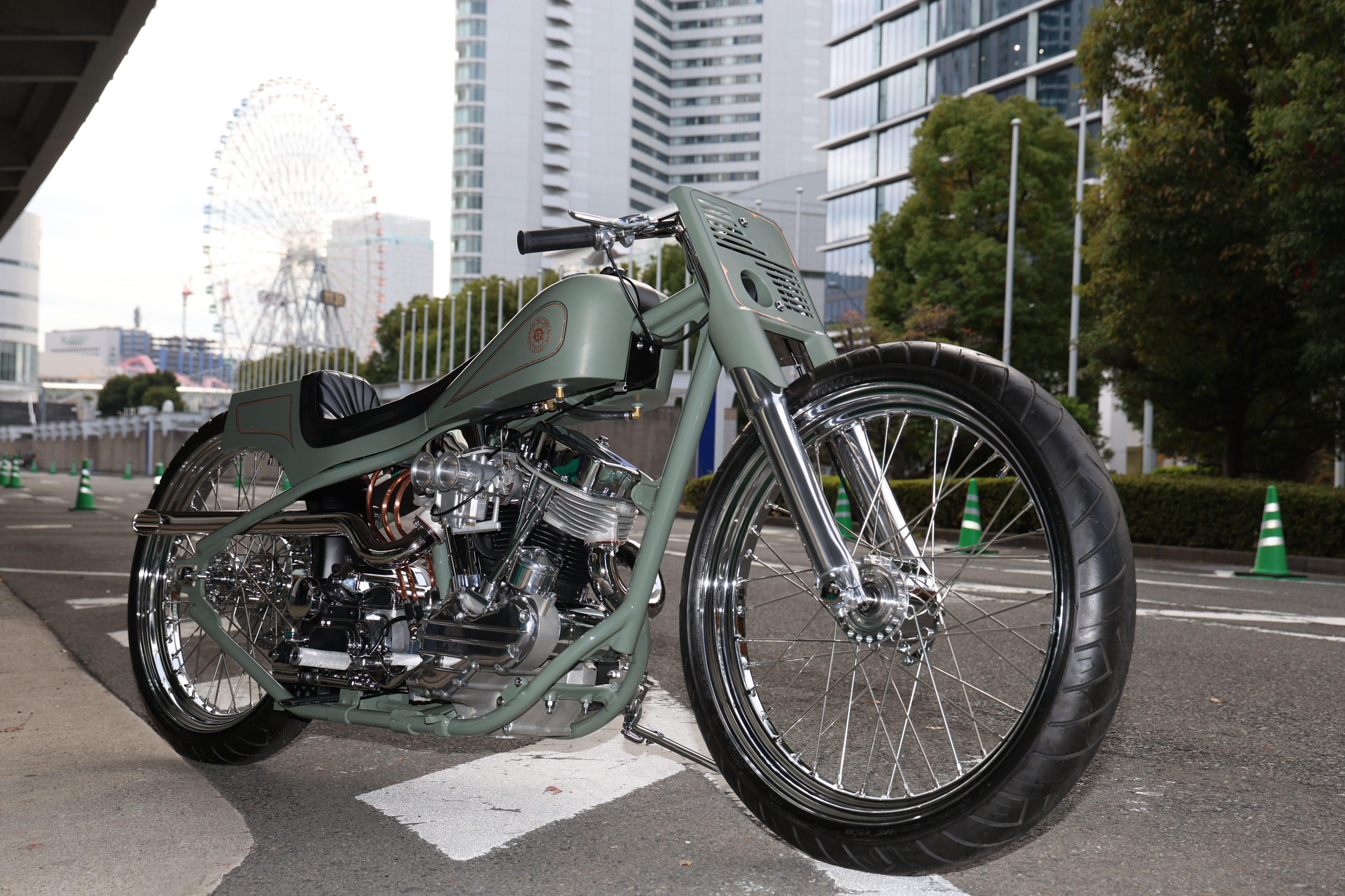 Yusaku's machine is driven by a P93 engine set into a Satomari custom-built frame, featuring a double backbone chassis and dedicated subframe, integrated with a 1969 partial frame and engine mount for structural authenticity and visual lineage. Rolling on 23 inch steel rims front and rear wrapped in Shinko tires, the stance is tall, purposeful, and unmistakably aggressive. Every piece of sheet metal on the bike is hand-fabricated by the builder, reinforcing its one-off nature. Power is delivered through an H-D Evolution 5-speed transmission and a Belt Drives Limited primary drive, keeping the drivetrain proven and reliable. The riding position is anchored by a custom leather seat crafted by A-Luco-Design of Hiroshima, Japan- while 41mm telescopic suspension maintains a clean, no-nonsense front end. Finished in Freestyle paint by Freestyle Paint (Kanagawa, Japan), the build is defined by carefully chosen details, including an S&S two-throat carburetor and Satomari custom-made handlebars paired with a billet triple tree. The overall concept channels the stripped-down intensity of a vintage drag racer, distilled to its essentials- simple, functional, and unapologetically fast.