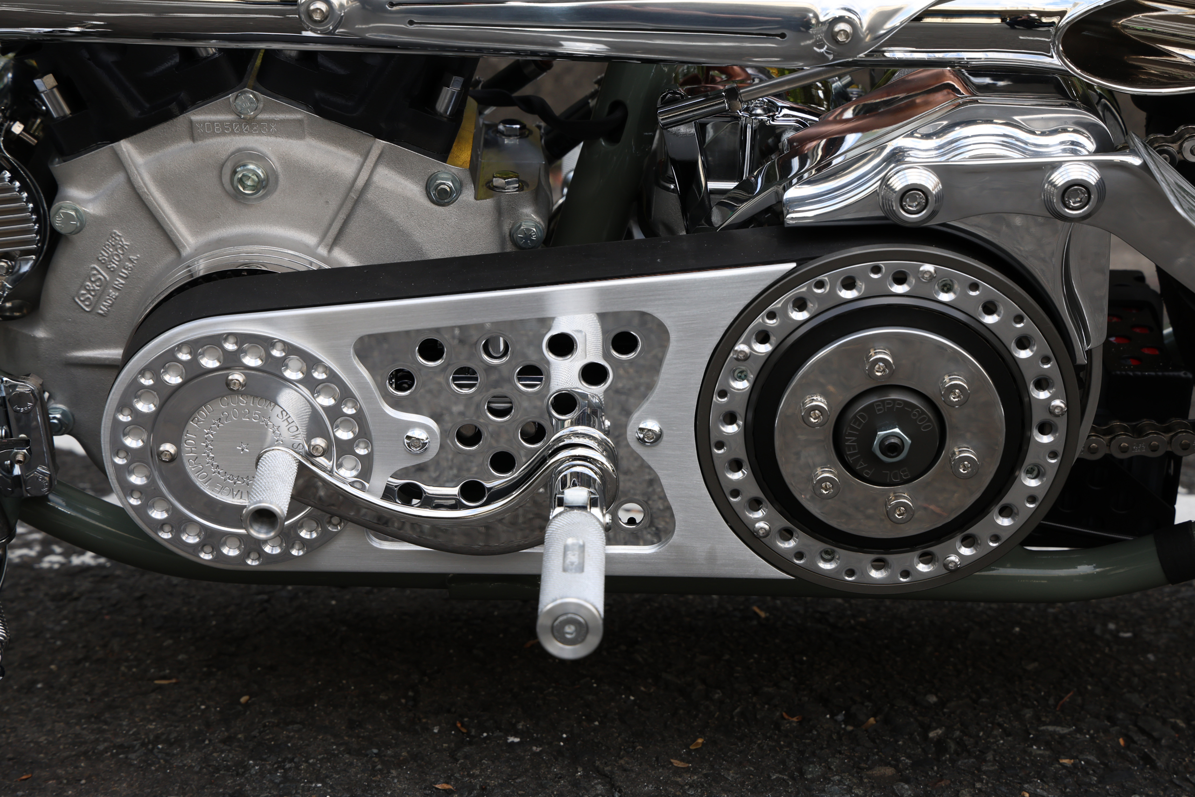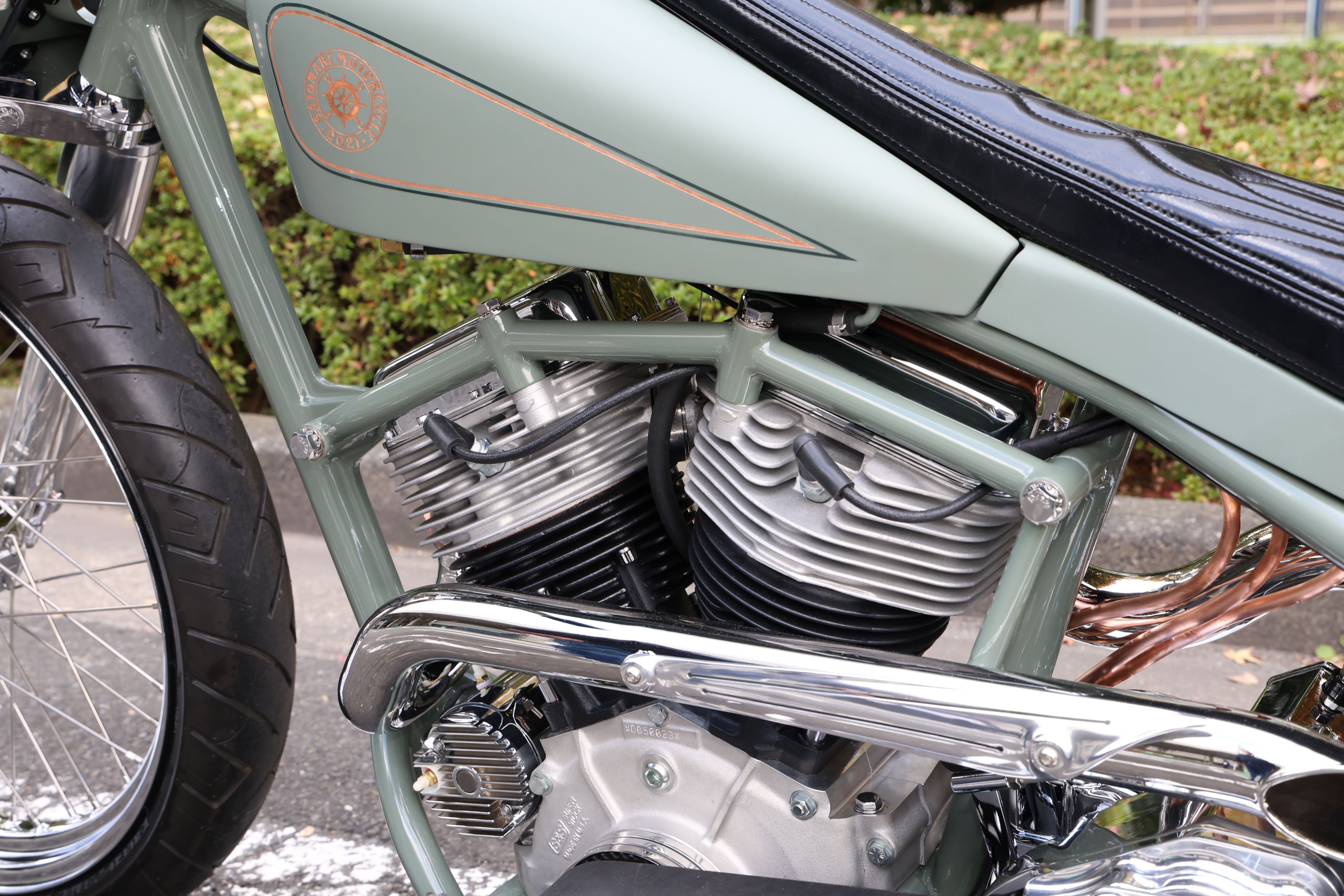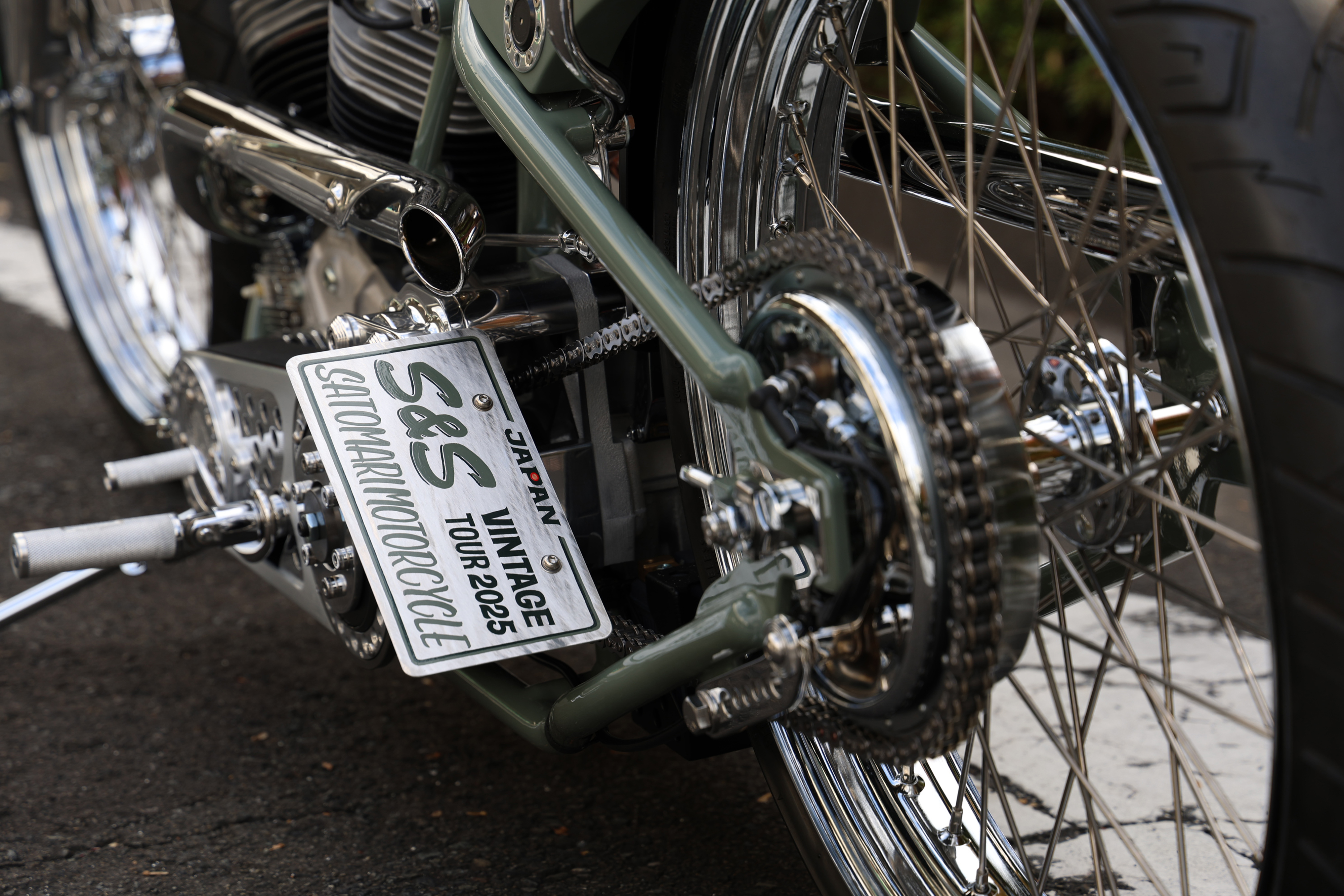 Yusaku's machine is driven by a P93 engine set into a Satomari custom-built frame, featuring a double backbone chassis and dedicated subframe, integrated with a 1969 partial frame and engine mount for structural authenticity and visual lineage. Rolling on 23 inch steel rims front and rear wrapped in Shinko tires, the stance is tall, purposeful, and unmistakably aggressive. Every piece of sheet metal on the bike is hand-fabricated by the builder, reinforcing its one-off nature. Power is delivered through an H-D Evolution 5-speed transmission and a Belt Drives Limited primary drive, keeping the drivetrain proven and reliable. The riding position is anchored by a custom leather seat crafted by A-Luco-Design of Hiroshima, Japan- while 41mm telescopic suspension maintains a clean, no-nonsense front end. Finished in Freestyle paint by Freestyle Paint (Kanagawa, Japan), the build is defined by carefully chosen details, including an S&S two-throat carburetor and Satomari custom-made handlebars paired with a billet triple tree. The overall concept channels the stripped-down intensity of a vintage drag racer, distilled to its essentials- simple, functional, and unapologetically fast.